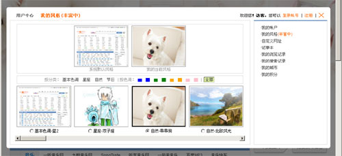 答:在首页右上角点击“个性化管理中心”点击“我的风格”即可设置各种风格。风格以cookie保存,见下图: