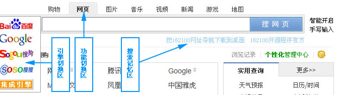 答:在各页面均有搜索引擎模块,并集成了各大著名搜索引擎,可一站式使用,可进行任意功能切换,优化搜索,见下图: